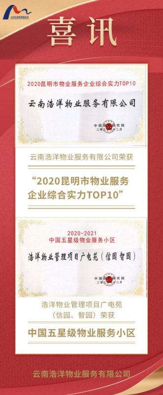 喜訊,我公司榮獲“中國指數(shù)研究院”頒發(fā)的“2020昆明市物業(yè)服務(wù)企業(yè)綜合實力TOP 10”榮譽稱號,其中,我公司服務(wù)管理的“廣電苑-信園”、“廣電苑-智園”小區(qū),榮獲“中國指數(shù)研究院”頒發(fā)的“中國五星級物業(yè)服務(wù)小區(qū)”榮譽稱號。